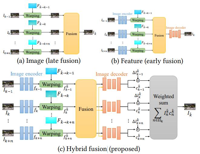 混合空间融合和特征空间融合的核心区别在于图像解码器的输入。下图 5(b)中的图像解码器仅将融合特征作为输入来预测输出帧。融合的特征映射已经包含来自多个帧的混合信息。因此,图像解码器可能难以合成锐利的图像内容。相比之下,图 5(c)中的图像解码器以融合的特征映射为指导,从扭曲的特征重构目标帧。实证研究发现,这提高了输出帧的锐度,同时避免了重影和毛刺伪影。