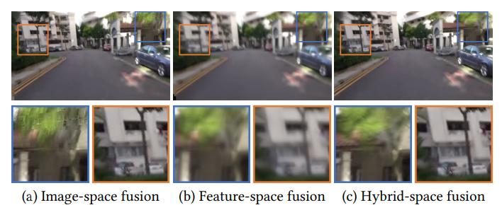 融合空间:研究者探讨了几种融合策略来处理对齐的帧。首先,他们可以在图像空间中直接混合扭曲的颜色帧产生输出稳定帧,如图 3(a)所示。这种图像空间融合方法在图像拼接、视频外插和新视角合成中很常用。