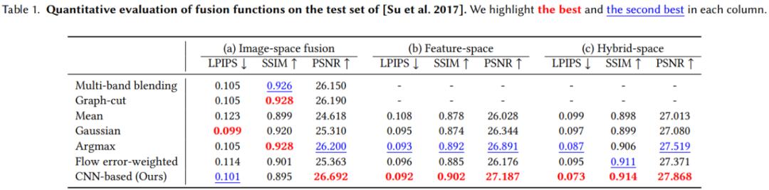 可以将图像编码为抽象的 CNN 特征,在特征空间中进行融合,并学习到一个解码器,可将融合后的特征转换为输出帧。这种方法对流不准确性具有较好的鲁棒性,但通常会产生过度模糊的图像;