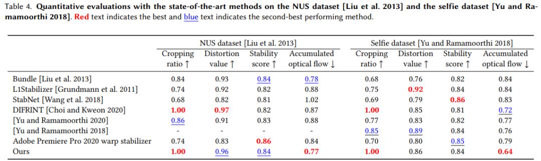 量化评估该研究使用以前提出的一些 SOTA 视频稳定算法对所提出的方法进行了评估,结果如下表 4 所示: