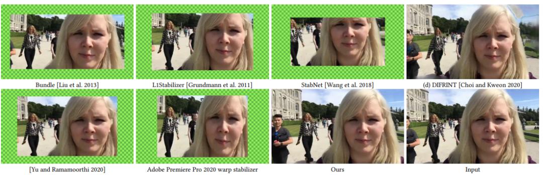 视觉比较在下图 10 中展示了该研究所用方法的一个稳定框架和来自 Selfie 数据集的最新方法。该方法生成的全帧稳定视频具有较少的视觉伪影。