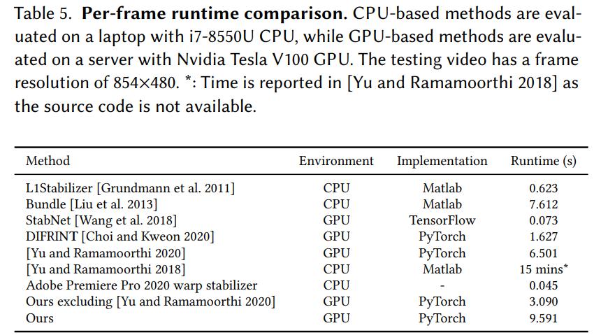 该研究在基于 CPU 方法 [Grundmann et al. 2011; Liu et al. 2013; Yu and Ramamoorthi 2018] 以及 i7-8550U CPU 笔记本上对运行时间进行了实验。此外,该研究还在基于 GPU 方法 [Choi and Kweon 2020; Wang et al. 2018; Yu and Ramamoorthi 2020]以及 Nvidia Tesla V100 GPU 上对运行时间进行了实验。测试视频的帧分辨率为 854×480。结果如下表 5 所示: