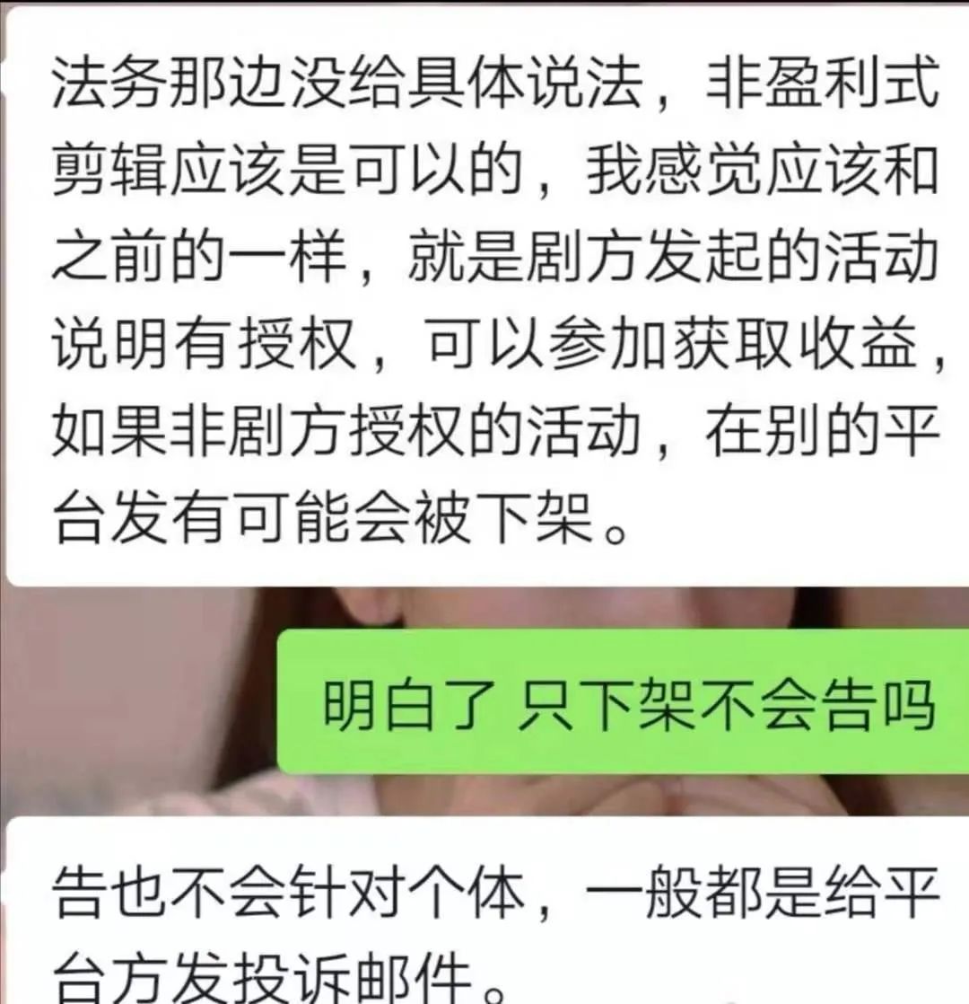 4月23日,影视行业第二次联合倡议书发出之后,影视博主龙龙在微博上说,该声明更多是针对纯搬运、cult剧透类的影视短视频。不过,她询问某平台方对接人时,对方表示,非剧方授权的活动,在其他平台发可能会被下架。