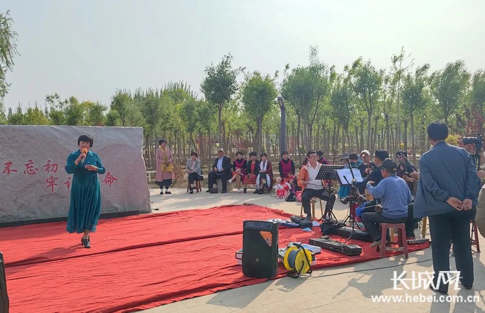 “雄安新区看未来,美好前景真不赖,现代之城要崛起,展望!”“雄安新区搞绿化、万亩森林造景观、花草伴随乡和镇,喜欢!”……来到张庄村新修建的生态公园内,20多位雄县同乐戏曲文化传播中心成员们正在公园里表演自创节目三句半《赞雄安》。