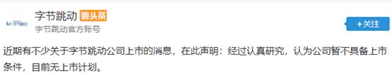 4月23日晚,字节跳动发布公告称,“近期有不少关于字节跳动公司上市的消息,在此声明:经过认真研究,认为公司暂不具备上市条件,目前无上市计划。”