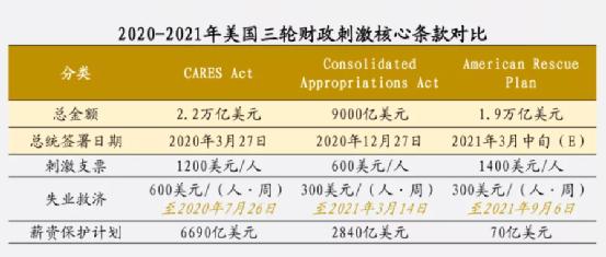 先来看看财政。最新1.9万亿的通过非常戏剧化。这个数字首先是远远超过大家预期的,因为拜登提出这项计划的最初,共和党支持的刺激数字只有6000多亿,之间差了1.3万亿。而拜登之前又一直声称两党要团结合作,大家就认为他会做个折中,最后放水量应该也就在9000亿美元左右。