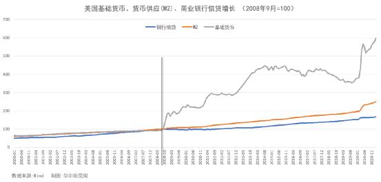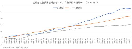 在QE前的世界,货币政策在上面一条道路上走得非常顺畅,即美联储通过常规货币政策提供的流动性,能很好地传到企业和居民手里。经济衰退时,一边积极的财政政策稳住企业和居民的信心,一边央行降低政策利率,同时给银行业提供流动性;商业银行一有钱,居民和企业也被低利率和财政刺激鼓舞着,积极借钱买房和投资。一旦经济开始复苏,央行所要做的就是逐步提高政策利率,抑制信贷,从而防止通胀。于是从图上可以看出,基础货币、货币供应、银行信贷三条线教科书一般地同起同落,在此过程中,长期利率也随政策利率下降和回升。2008年前的美欧,1990年前的日本就是处于这种状态。