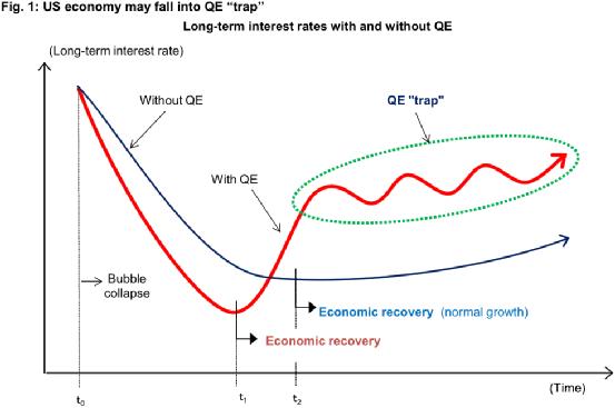 QE持续时间越长,这些问题无疑也会越严重。野村证券首席研究员辜朝明曾在2013年美联储第三轮QE期间,提出了一个“量化宽松陷阱”(QE Trap)模型,讨论了长时间QE对经济的损伤程度: