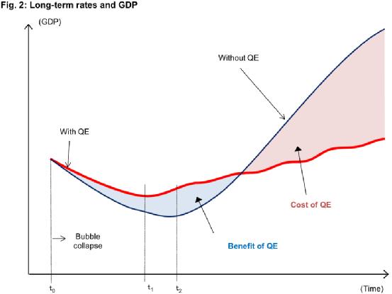 相比之下,非QE国长期利率下降是渐进的,这延迟了复苏的开始(t2);但一旦经济开始好转,由于利率较低,复苏步伐实际会更快。