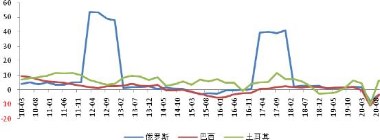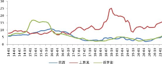这些具有高开放性和外贸依赖的新兴市场国家,很大程度上,只能被动接受发达国家经济和政策的溢出。然而,相对于通胀的上行,这些新兴国家的经济修复还处于一个相对偏慢的过程中,尤其是巴西和土耳其,失业率高企10%以上,同时对疫情的控制也再度面临考验。图:经济修复尚需时日