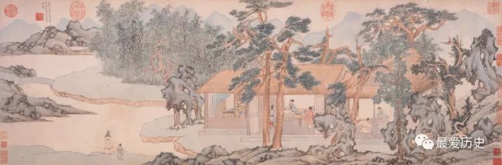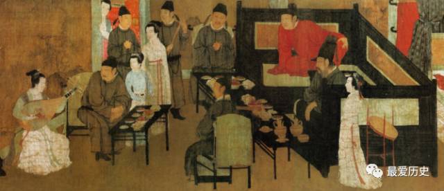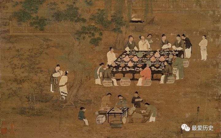 ▲北宋佚名宫廷画家:《听琴图》(也传为宋徽宗所作)虽然是历史上的著名昏君,但却是顶级艺术天才的宋徽宗赵佶,也画下了在假日里,宋朝的士大夫们一起宴会的情境: