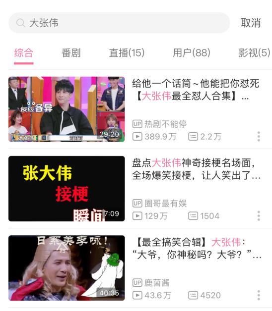 ▲在B站搜索大张伟,出现大量“怼人”、“搞笑”、“梗王”的相关词条被他的金句逗乐的人们,给他加了一个前缀:“人间精品”。