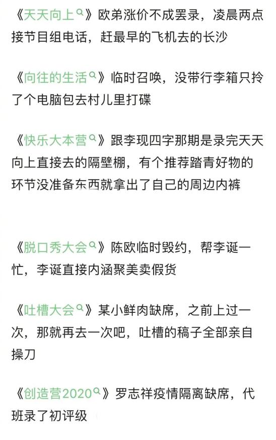 ▲网友统计的大张伟救场的部分综艺(图源:豆瓣)湖南卫视《谁是宝藏歌手》的编剧慕慕认为,大张伟是节目的“粘合剂”,起到的重要作用是——让场子不冷。