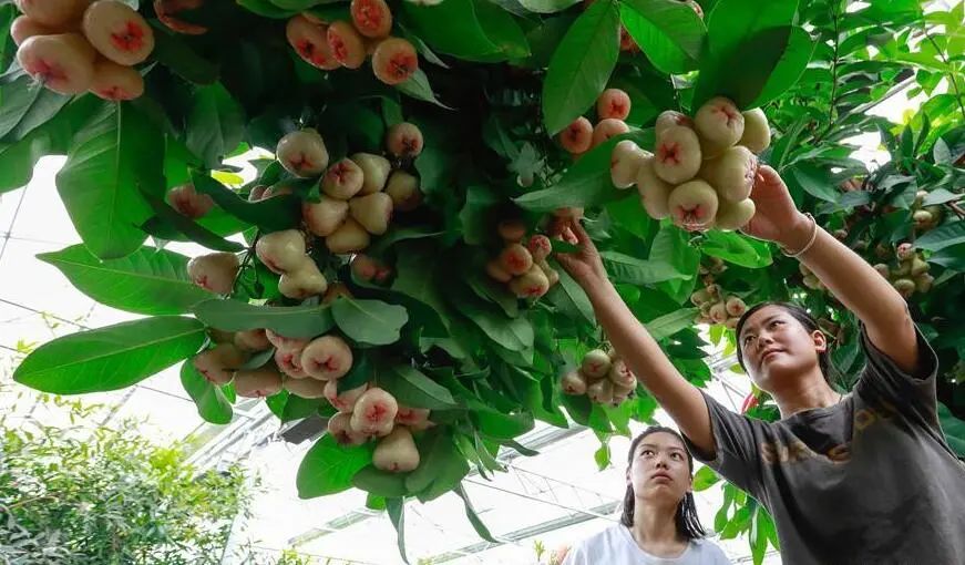 从东南亚国家引进种植的莲雾成熟上市,吸引游客采摘品尝。莲雾的培育成功,是许多地方调整农业种植结构,依靠科技创新,推进“南果北种”的一个缩影。(资料图 来源:新华社)近期
