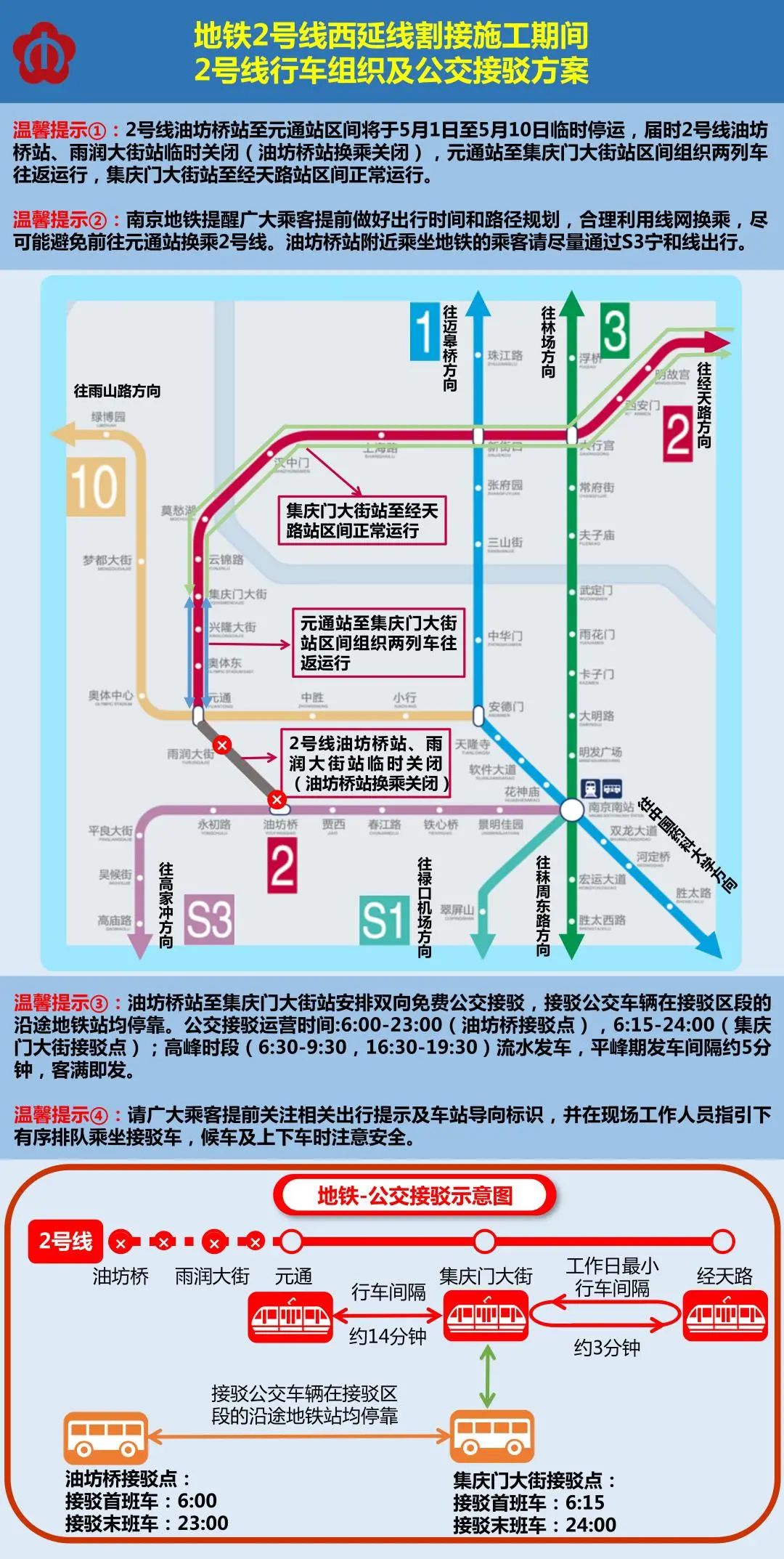根据地铁建设计划,在建2号线西延线即将接入既有2号线油坊桥站,受割接施工影响,地铁2号线油坊桥站至元通站区段将于5月1日至5月10日临时停运,届时2号线油坊桥站、雨润大街站临时关闭(S3宁和线油坊桥站正常运行、换乘通道关闭),2号线其余区段的行车组织将配合调整。