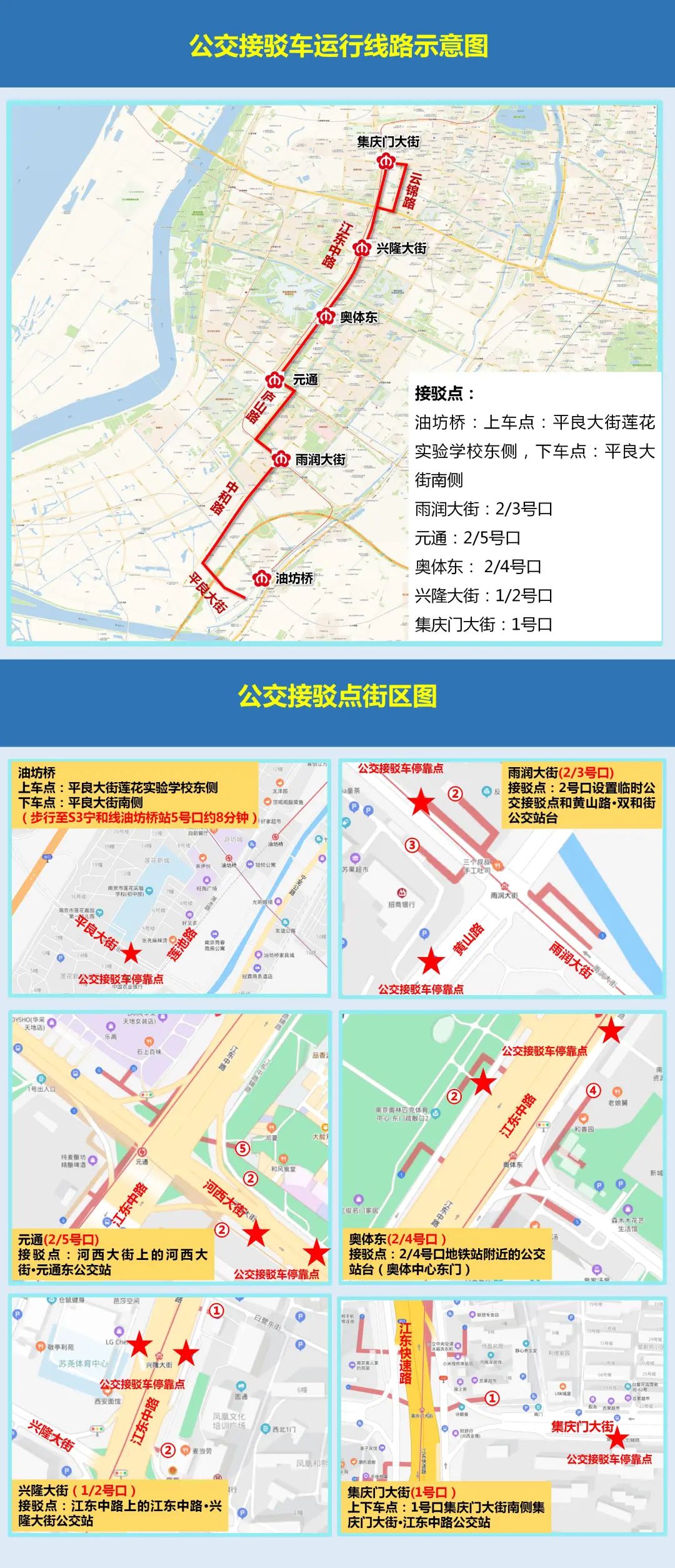 油坊桥站至集庆门大街站双向组织免费公交接驳,停靠沿途各地铁站点