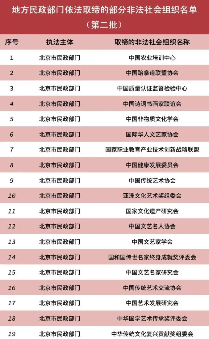 民政部昨天公布了第二批地方民政部门近年来依法取缔的部分非法社会组织名单。社会公众如果发现名单中的非法社会组织仍在开展活动的,可依法向公安机关报案。名单如上。