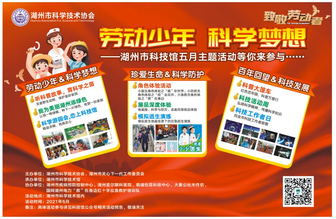 在“五一”假期期间,市科技馆将陆续开展“听科普故事,育科学之苗”“科学游园会,恋上科技馆”“我为美丽湖州添绿色”“手工DIY,科学妙妙屋”“科普新生代之立夏节气探究”等主题活动。详情>>