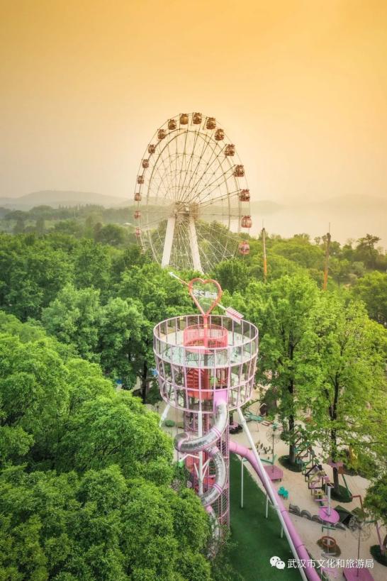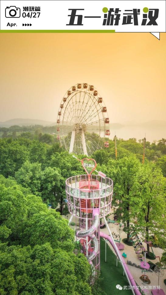 坐完摩天轮,还可以去一旁刚升级的「欢乐丛林」继续玩。升级后化身粉粉世界,并开放了丛林拓展、彩虹滑道、东湖之舟等项目。五一期间,「欢乐丛林」还将延长开放至晚上8点。东湖,也可以越夜越浪漫。