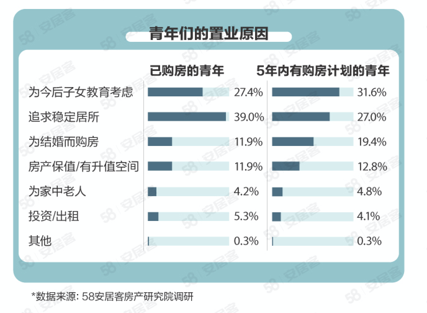 买房大潮流下,不同群体需求各异。58安居客房产研究院调研数据显示,已购房青年中39%表示买房为了“追求稳定居所”,在所有置业初衷中占有最大比例。而5年内计划购房的青年置业风向则切换至“为今后子女教育考虑”,选择该选项的占比高达31.6%,居于首位。