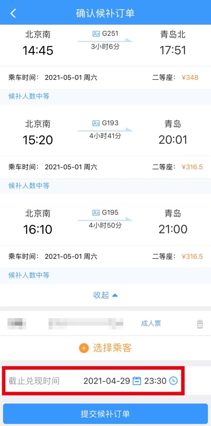 ▲候补列表中可以查看车次、候补人数等信息。第二步:点击“提交候补订单”