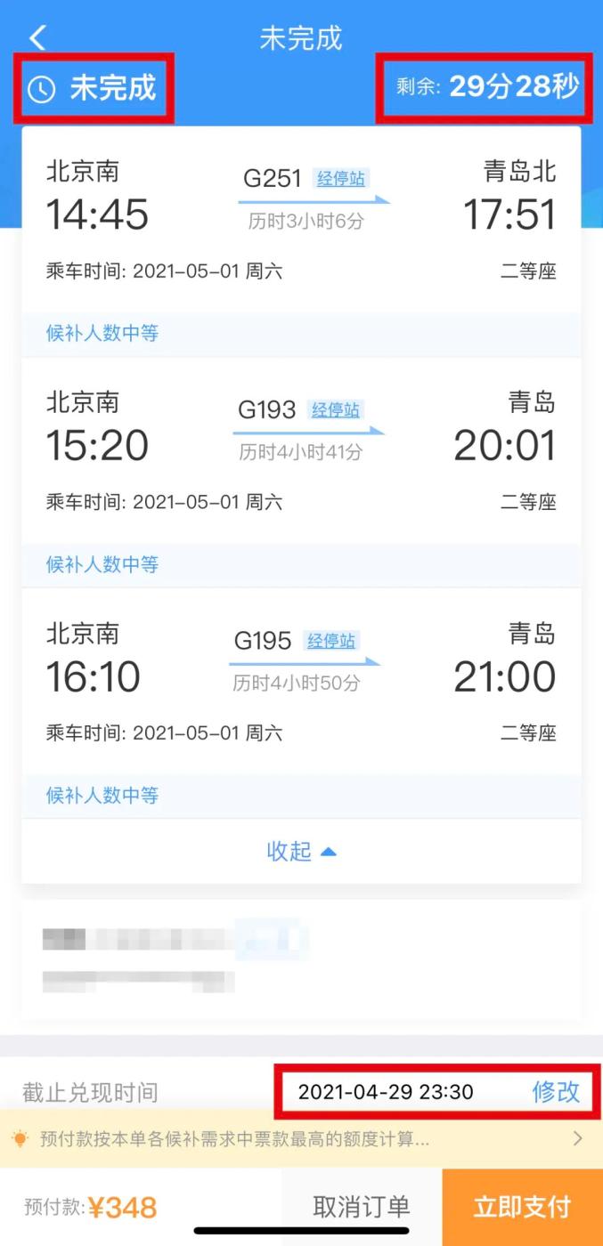 ▲旅客需要在30分钟内完成候补订单的支付。▲预付款按本单各候补需求中票款最高的额度计算。
