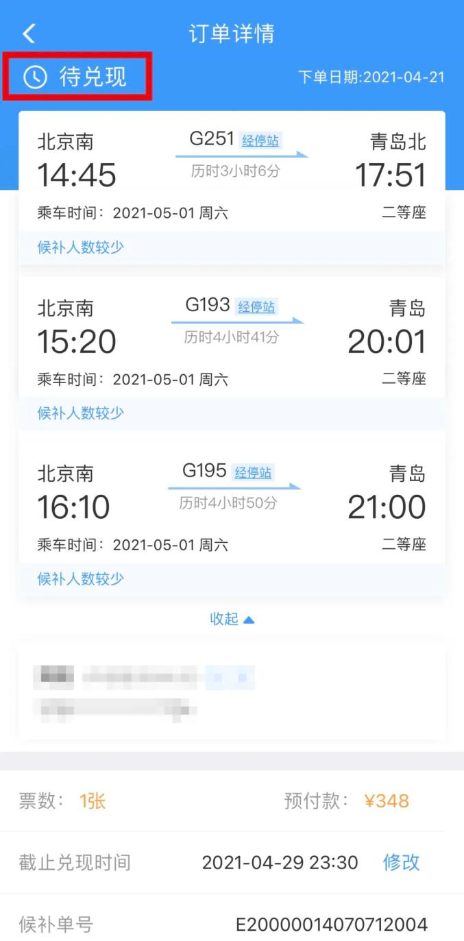 ▲支付成功后,候补订单进入待兑现状态。第四步:查看“候补订单”