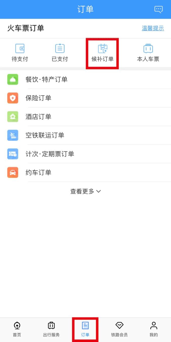 打开铁路12306APP,点击导航栏订单中的“候补订单”,可查看所有已支付候补订单,待支付订单可以在订单项“待支付”中查看。