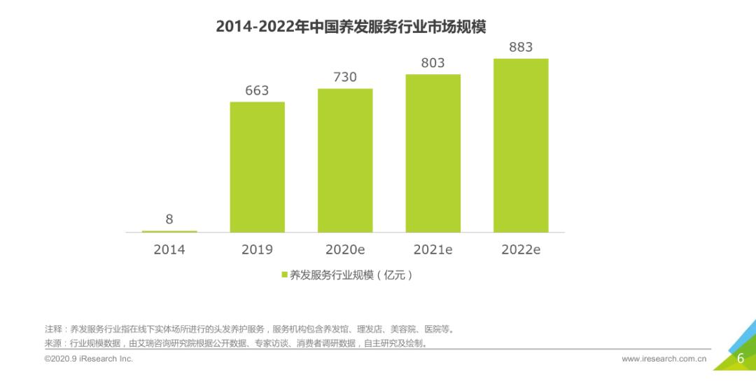 根据艾瑞咨询数据显示,2019年养发服务行业规模达663亿元,预计未来十年增速在10%左右。