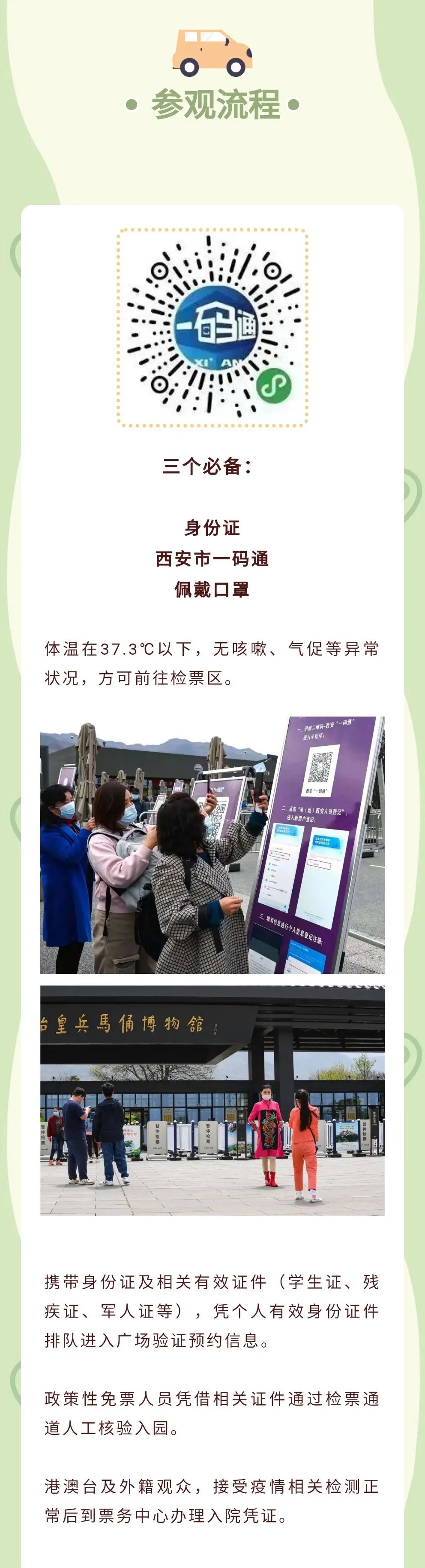 根据疫情防控要求,观众须携带身份证、出示西安市一码通,体温在37.3℃以下,无咳嗽、气促等异常状况,方可前往检票区。全程佩戴口罩,排队及参观过程中,须与他人保持安全距离。如发现体温异常或其他紧急状况,须立即就医或在临时隔离点配合接受防疫检查。港澳台及外籍观众,接受疫情相关检测正常后到票务中心办理入院参观凭证。参观区设置导向标识和设施,实行单向参观线路,观众请勿逆行。