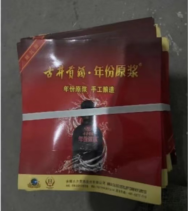 据介绍,许某曾因非法制造注册商标标识罪被判刑,2020年6月,许某“重出江湖”,拉上林某,在平阳某作坊内雇佣工人再次仿冒“古井贡”酒包装材料,其中包含手提袋半成品盖光覆膜、印刷防伪标签、铁皮封盒顶盖等。