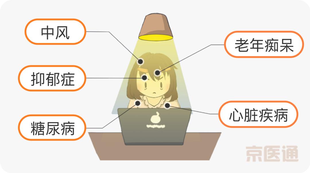 长期熬夜还会增加心脑血管病、甚至老年痴呆的风险。