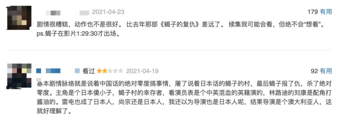 “正片90%废话,10%打斗场面五毛钱的武术指导,看看官方发的7分钟开头就可以了。”