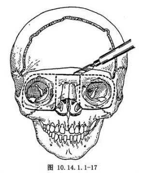 图源:眶颧整形外科学Ⅲ度增宽患者:需施行颅内外联合径路“O”型截骨矫正术以彻底游离眶缘骨架,截除眶间多余骨块,眶架在新的位置重新固定。三度眶距 增宽伴眶纵轴倾斜的特别严重病例:可选用中面部劈开法 (Bipartition)以彻底改善眼眶形态。