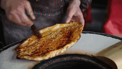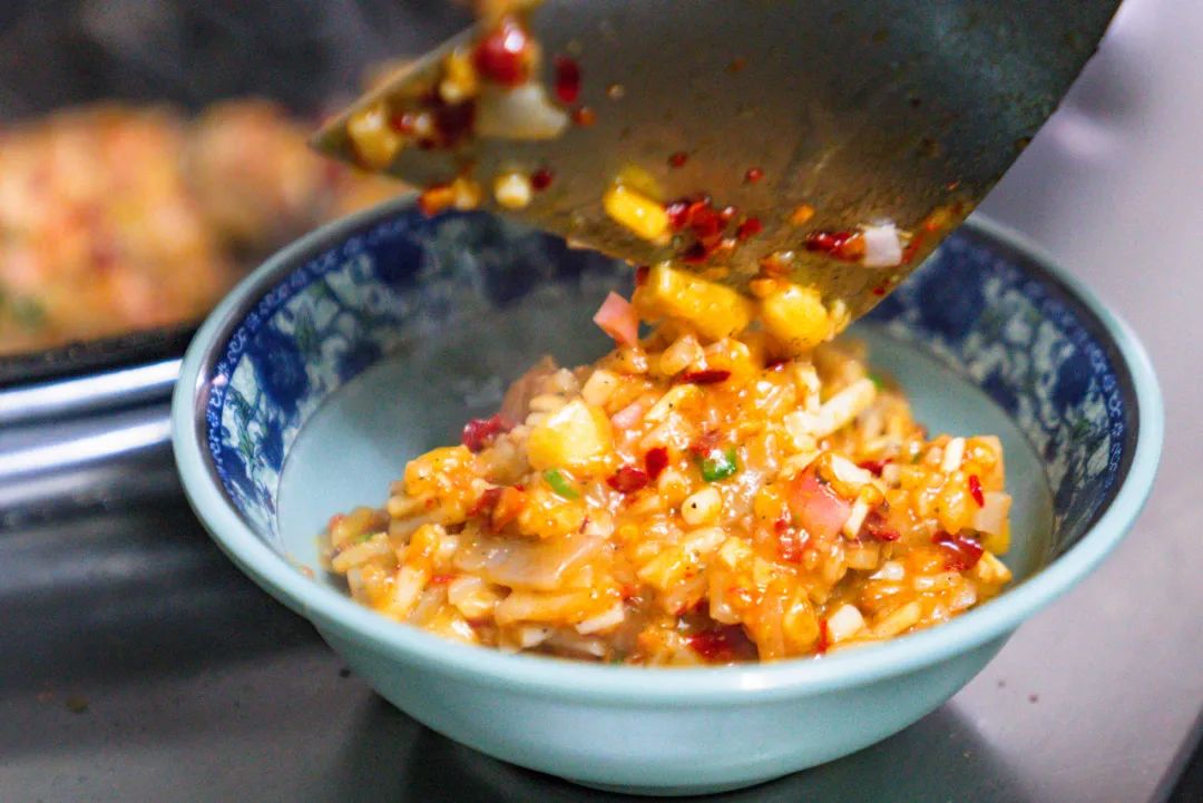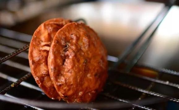 这个名字看起来简单,却和我们想的不同。先用大米磨成米浆,在烙锅里一圈圈地画圆,这些圈圈凝固之后,豆皮儿的第一步就算完成的。