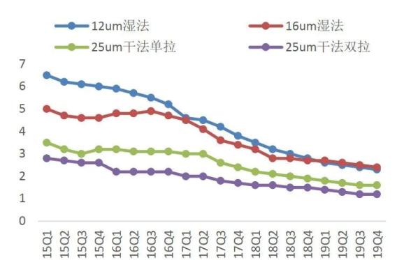 对于追求高能量密度的三元电池而言,要求放的正负极材料尽量多,所以薄膜就得越薄越好,哪怕湿法隔膜更贵,但也不得不成为首选。现在国内的湿法隔膜厚度可以做到7微米,甚至5微米,而干法隔膜却很难做到12微米以下。