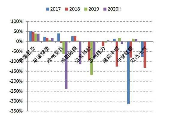 图3:2015-2019年隔膜价格一直下探(单位:元/平方米),资料来源:高工锂电、东方证券结局就是冰火两重天。截至2020年上半年,国内的隔膜企业除龙头公司恩捷、星源材质之外,其他大部分隔膜公司仍处于持续亏损中,少数公司甚至处于“巨额亏损”状态,盈利遥遥无期,最终日子过不下去就面临破产或被收购的命运。2019年8月份,中材科技以增资入股的方式收购了湖南中锂,还有被恩捷收购的重庆纽米也是因为亏损不得最终选择不寄人篱下。