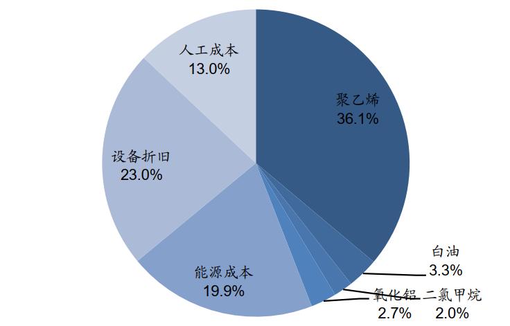 图7:恩捷股份维持了较高的产能利用率,资料来源:公司公告,开源证券再深入一步,通过对恩捷的成本拆分,我们可以看到,原材料和设备折旧在隔膜制造成本中占比最大,而聚乙烯价格的走势主要与国际原油价格走势一致,属于大宗化工品,对上游的议价能力相对有限。最终降成本的措施主要往设备折旧下手。