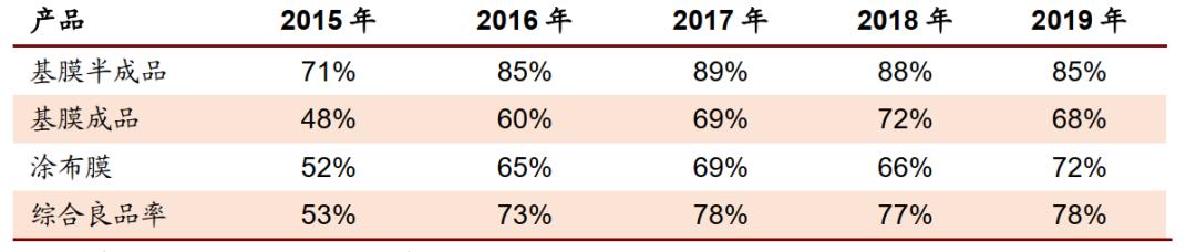 当然光有生产技术还远不够,由于原材料占到了成本的接近40%,良品率成了生产技术上面重要的指标之一,2019年公司的综合良品率达到78%,其中涂布膜良品率提升到了72%,随着在线涂布产线的增加,涂布膜的良品率将会继续提升。