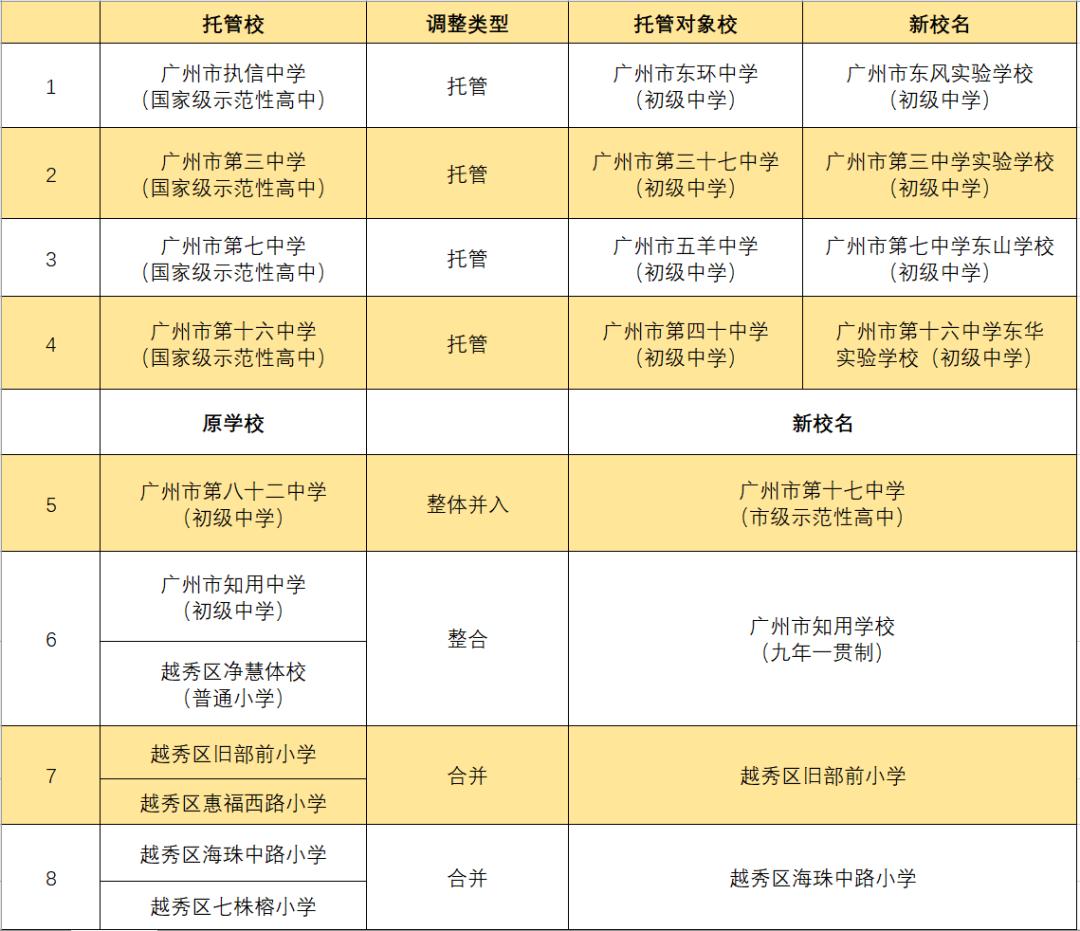 与此同时,还有7所学校涉及调整合并。其中:广州市第八十二中学整体并入广州市第十七中学;