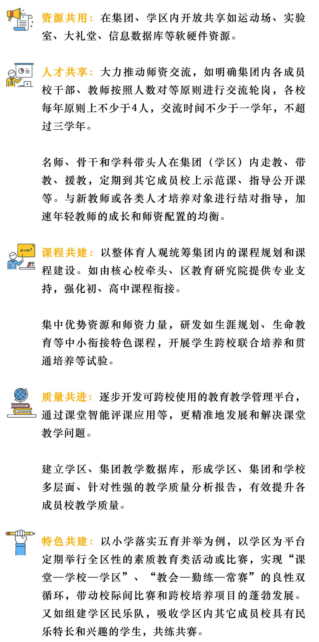 越秀区将通过加强“八个共同”(文化共建、资源共用、人才共享、学生共育、课程共建、课题共研、特色共建、质量共进),全学段、全方位地促进紧密共建,确保学区化集团化办学取得实效。比方说: