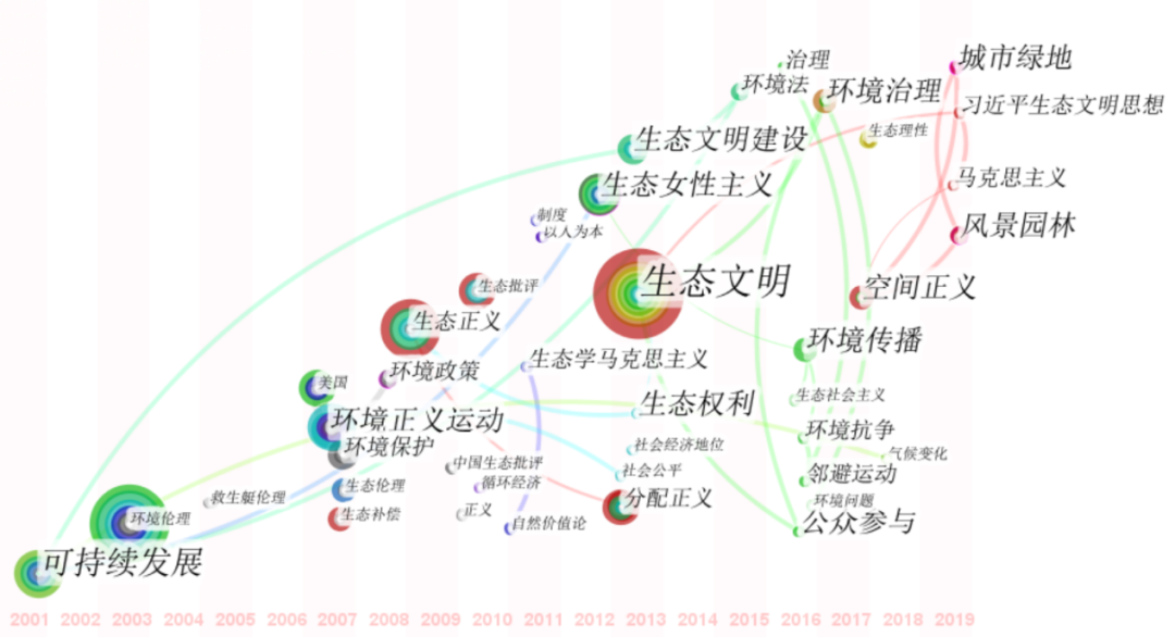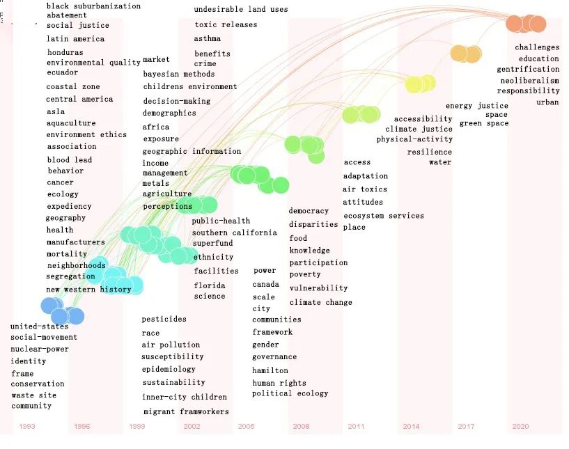 从几个方面梳理国内外环境公正的研究进展,首先是国外研究热点。用Citespace软件整理从20世纪90年代到2020年近期的一些关键热点问题,发现几个规律: