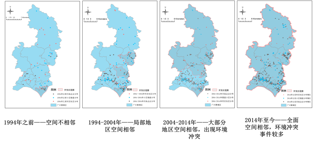 分析环境公正问题的形成机制,研究主要从政府、企业、居民出发。以广州市开发区为例,将广州市开发区的污染企业与周边临近社区的空间环境对应,发现:在1994年以前,工厂、居住区与乡村空间不相邻;1994-2004年出现了一些局部的空间相邻;2004-2014年,大部分地区空间相邻,出现环境冲突;2014年至今,全面空间相邻,环境冲突事件较多。