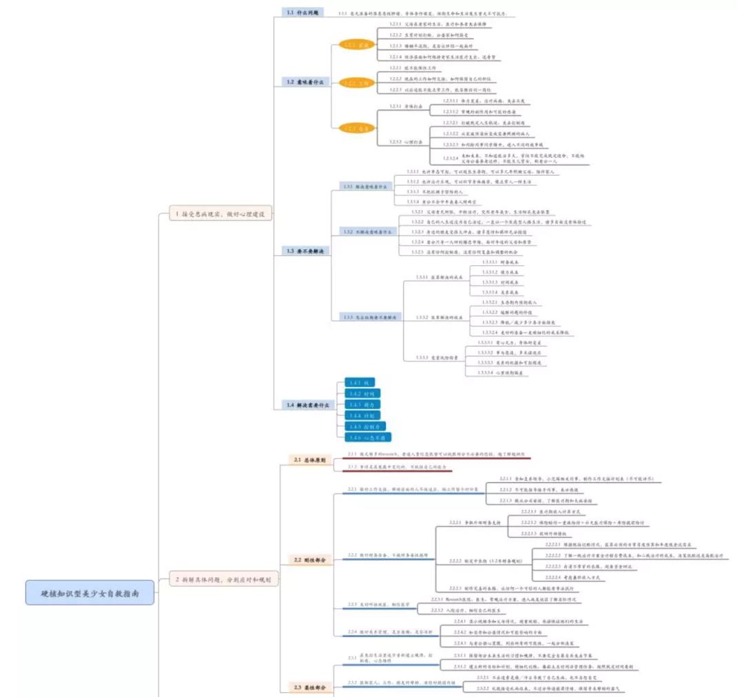她把自己从发现病情到住院、治疗的每一个细节、每一段心路历程,事无巨细地写出来,又以严谨、细致的条理,将指南拆分为“接受疾病的心理建设”、“拆解具体问题并应对”、“中长期可持续策略”、“独自面对的部分”4个大类,每个大类下再逐层拆分,列出96个应对细项,制作成脑图。