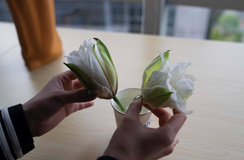工作室旁边的茶水间里,柱子哥放着一排用纸杯养的百合花的花骨朵。“花在运送的过程中,经常会有一些花骨朵被碰掉了,但其实它们还可以存活,我就把它们养起来。你看,它们都开得好好的。”