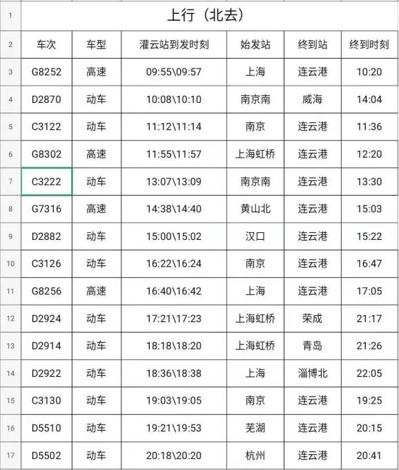 灌云站最新车次时刻表