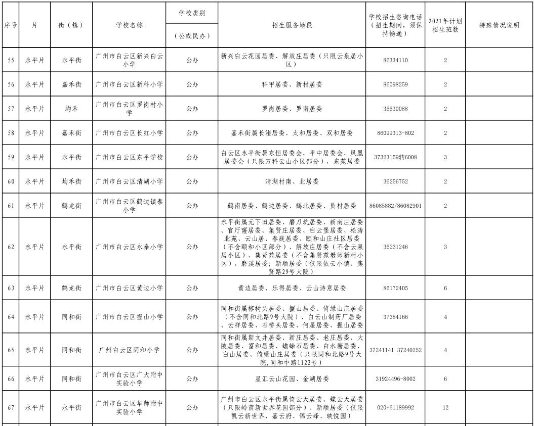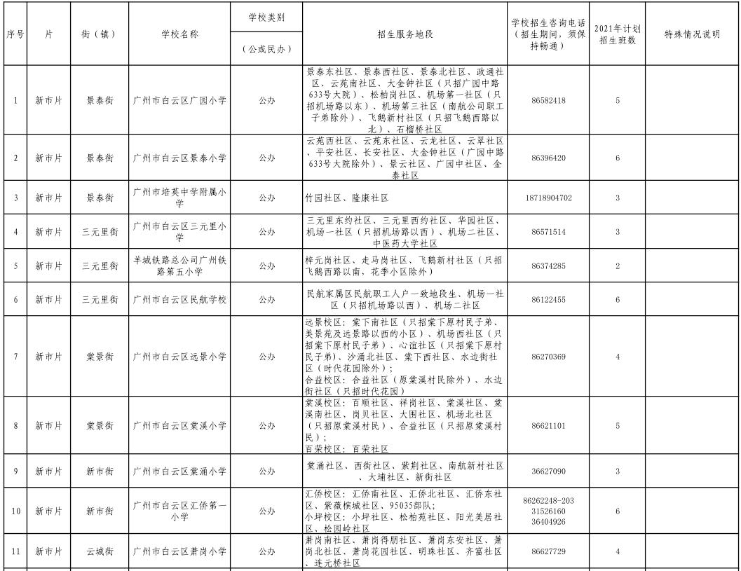 2021 年白云区义务教育学校招生计划表