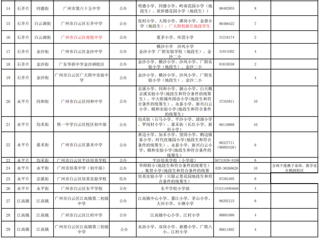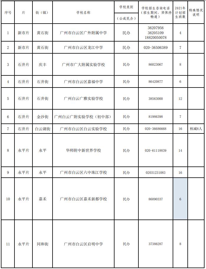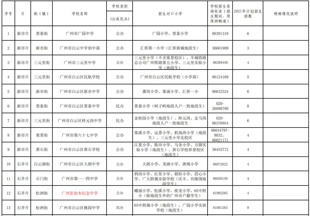 2021年白云区义务教育学校招生计划表(公办初中含小区配套学校)