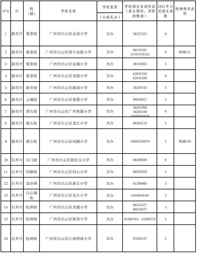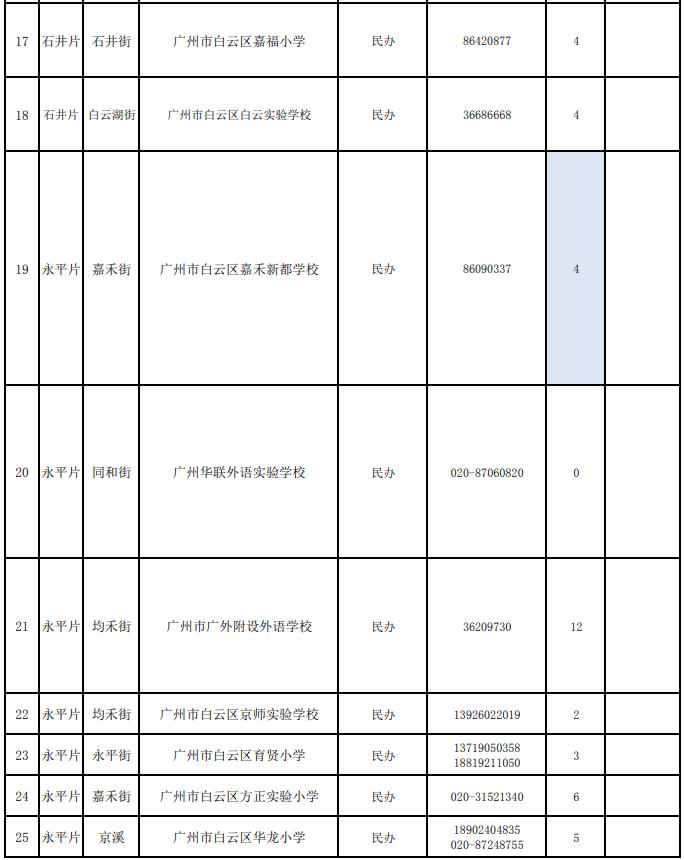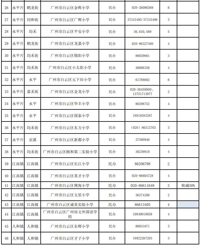 2021年白云区义务教育学校招生计划表(民办小学)