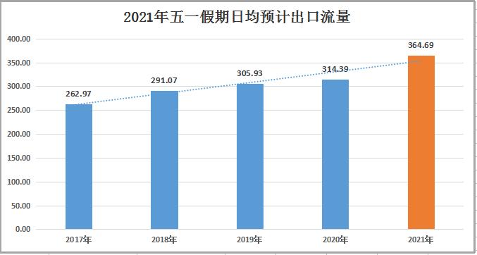预计2021年五一假期的出口总流量将比2020年上升15%-20%左右,日均达360-380万辆,出口总流量将超过1800万辆。节假日第一天流量最大,预计接近400万辆,再创历史新高。根据交通运输部《重大节假日免收小型客车通行费实施方案》,2021年五一假期高速免费通行时间为:自2021年5月1日0时起—2021年5月5日24时止,全省高速公路收费站免收7座以下(含7座)小型客车通行费,免费时段以驶离收费站出口的时间为准。